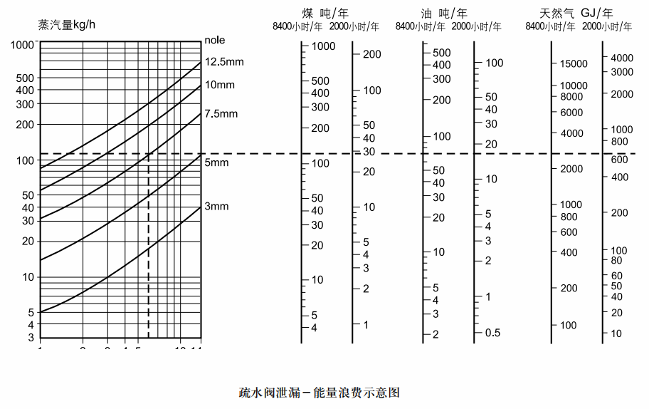 如果一个疏水阀上有一个7.5mm的小孔,操作压力为6 bar。从图中可知,每小时泄漏的蒸汽量约为110千克。? 一天2 4小时,一周七个工作日,一年5 0个工作周=8400小时? 一天8小时,一周五个工作日,一年5 0个工作周=2000小时按每年8400小时计算,每年浪费110吨煤或2200GJ天然气。