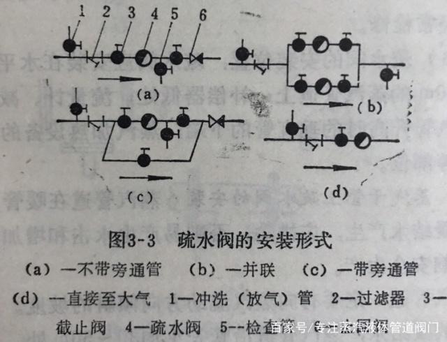 疏水阀的安装形式主要是处理好它与旁通管、冲洗(放气)管、检查管或视镜、止回阀、过滤器等的位置,如图a所示。