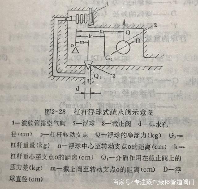 图2-28为截止阀型杠杆浮球式疏水阀的结构示意图。杠杆浮球式疏水阀排水稳定,漏气率小,性能可靠,排出饱和水,但排量较小。