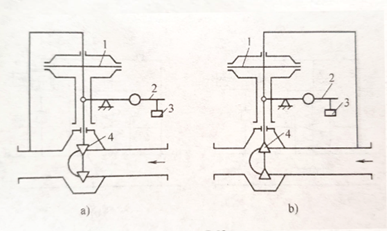 带指挥器的自力式压力调节阀,如图1所示为带指挥器的自力式压力调节阀,采用图1a所示的阀后压力调节时,当被调介质的压力升高,作用在主阀膜片2下面的压力就大于上面的压力,阀芯9向上移动,使流通面积减小,这样,阀后压稍微下降,同时作用在指挥器膜片3上的压力增大,当作用在指挥器膜片3上的力大于指挥器给定弹簧7的力时,指挥器膜片组件6向右移动,挡板4靠近喷嘴5,指挥器的输出压力减小,通到主阀膜片2上面的压力随之降低,阀芯9继续向上移动,流通面积继续减小,被调介质的压力继续降低,直到与指挥器给定弹簧7的力相平衡为止。反之,当被调介质的压力降低时,作用在指挥器膜片3上的压力减小,当这个压力小于指挥器给定弹簧7的力时,指挥器膜片组件6向左移动,挡板4离开喷嘴,指挥器的输出压力增大,将阀芯9打开,阀后压力回升到给定值,针形阀1用做调整放大倍数,过滤器8能够滤去介质中的颗粒杂质,防止喷嘴被堵而失去作用。
