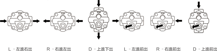 - 本体可在现场配管时依需要拆下四个螺丝,盖子不动本体回转,可以左进右出、右进左出、上进下出、左进前出、右进前出、上进前出共六中选择,依箭头指示。