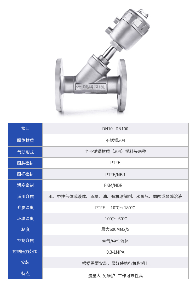 气动形式采用全不锈钢形式和塑料头、铝合金两种。使用介质广泛:水、中性气体或液体,酒精,油,有机溶解剂,水蒸汽,弱碱或者弱酸。